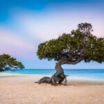 Caminando por Eagle Beach, los visitantes pueden ver las icónicas palmas y árboles divi-divi que caracterizan esta costa. Estos árboles no solo aportan sombra natural, sino que también crean un ambiente único y fotogénico. Su forma distintiva, moldeada por los constantes vientos alisios, se ha convertido en un símbolo representativo de la isla.